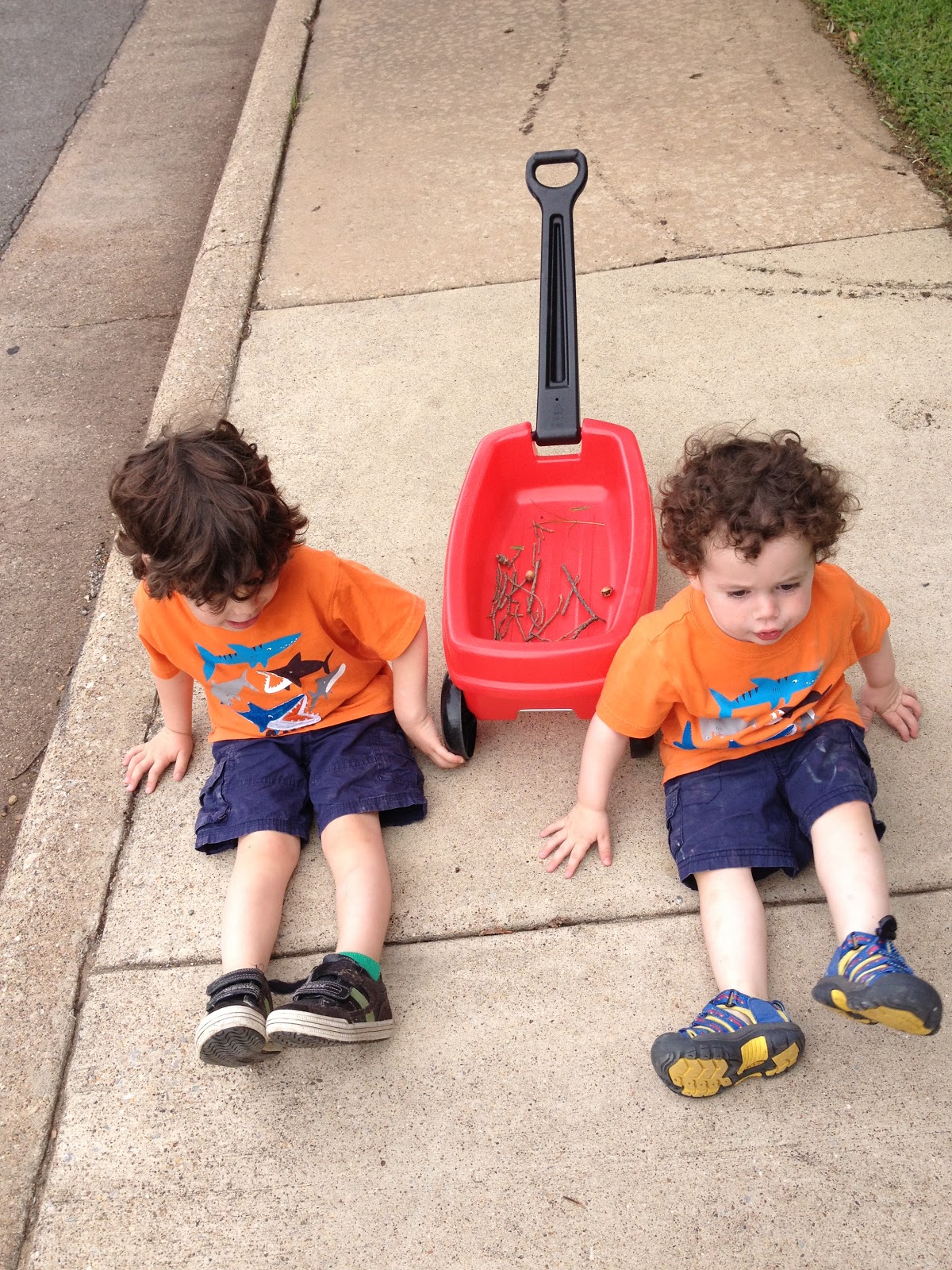 Here are the guys on a nature walk. Tahl declared it story time, so they sat down to tell a story. Tahl's story was about how there was a frog in a tree. The end. Then Zev told a story about his new bike.