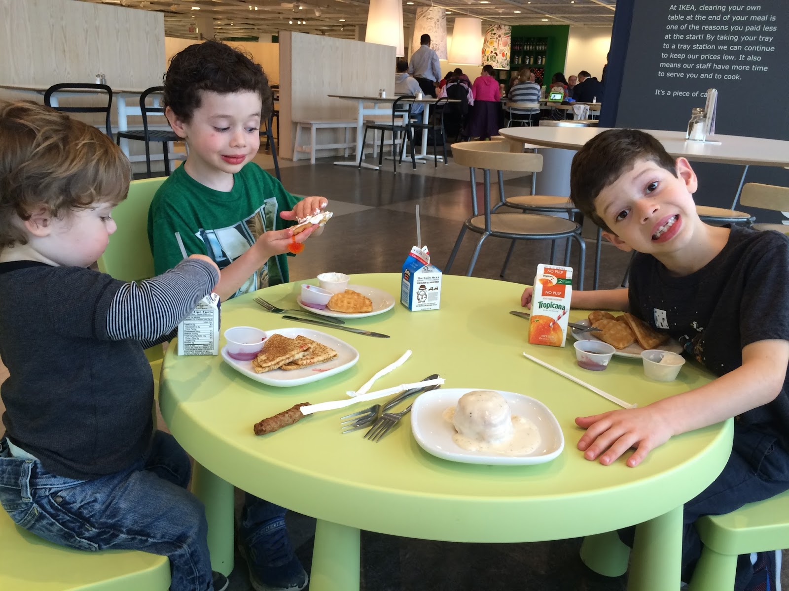 Thursday, Isaac and Tahl went to get a haircut. Zev got to come along for the ride. On our way home we stopped by IKEA. The guys were happy to have waffles there.
