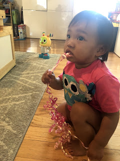 She liked her new monster shirt from her Mimi, but she liked the bow from Mimi's walker even more.